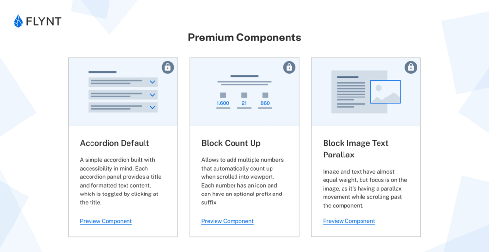 Unlock the true potential of your WordPress projects with Flynt's Premium Components. Designed for developers who value efficiency, customization and performance, these components are the key to creating maintainable and customizable WordPress websites. With 18 additional components, you'll have a vast array of options at your disposal, allowing you to build unique experiences and ensuring design consistency across your projects.